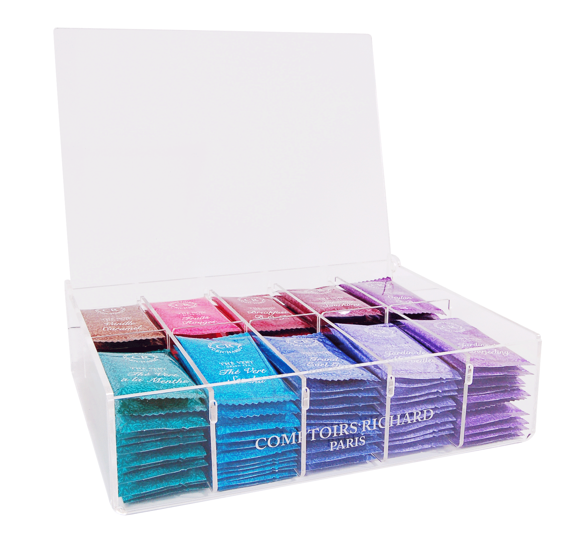 Display din acril cu 10 compartimente speciale pentru ceaiurile Comptoirs Richard *Pliculete de ceai din imagine nu sunt incluse in pret .